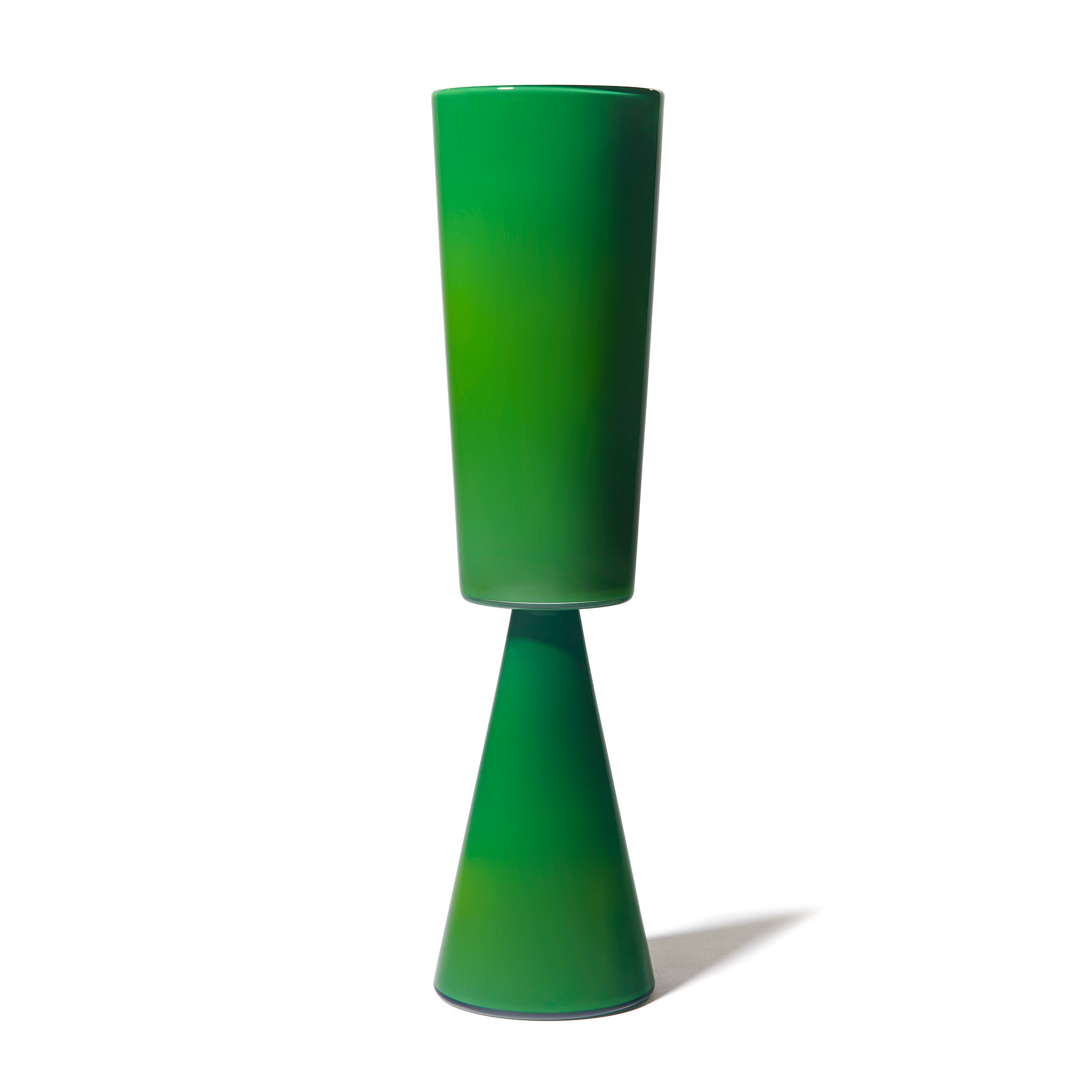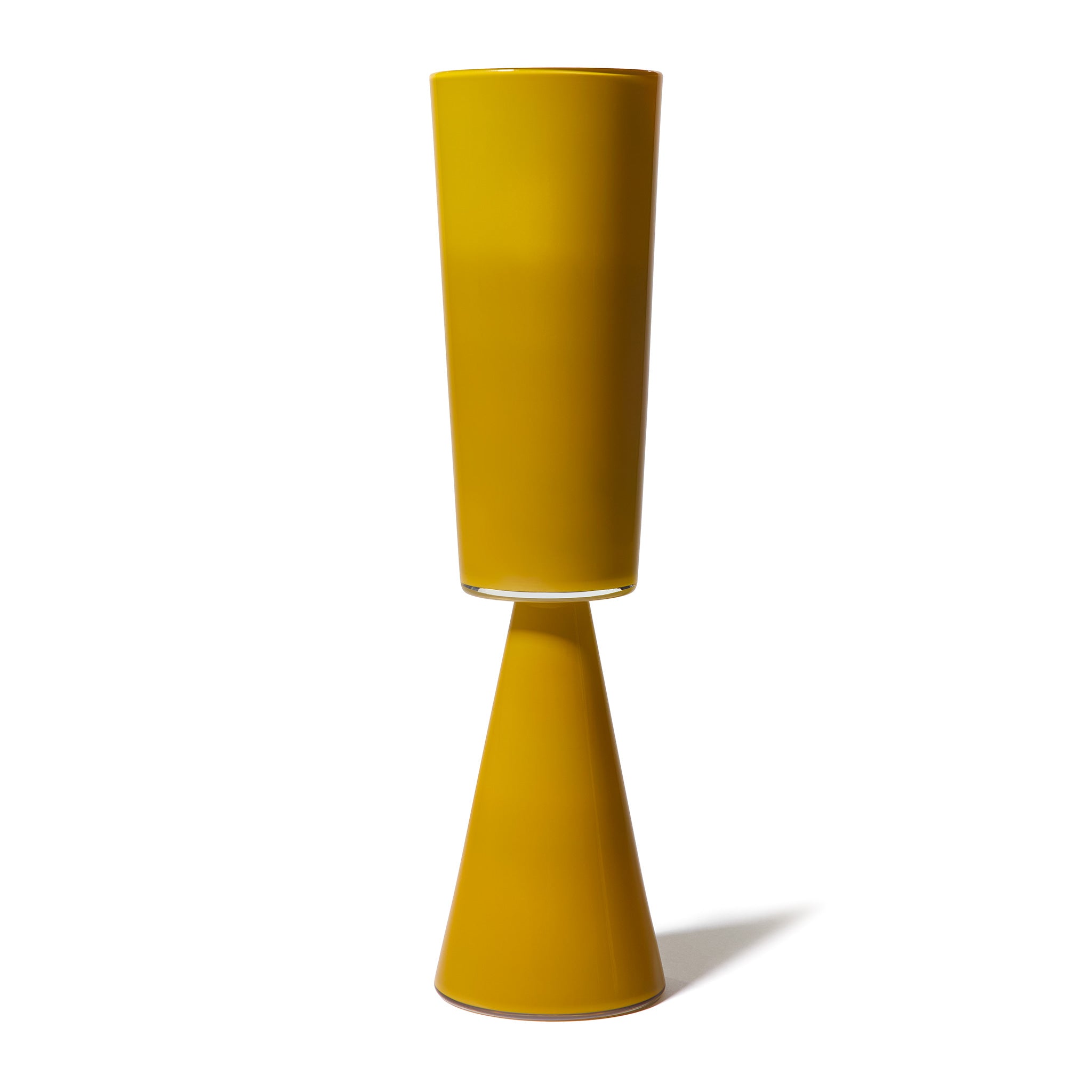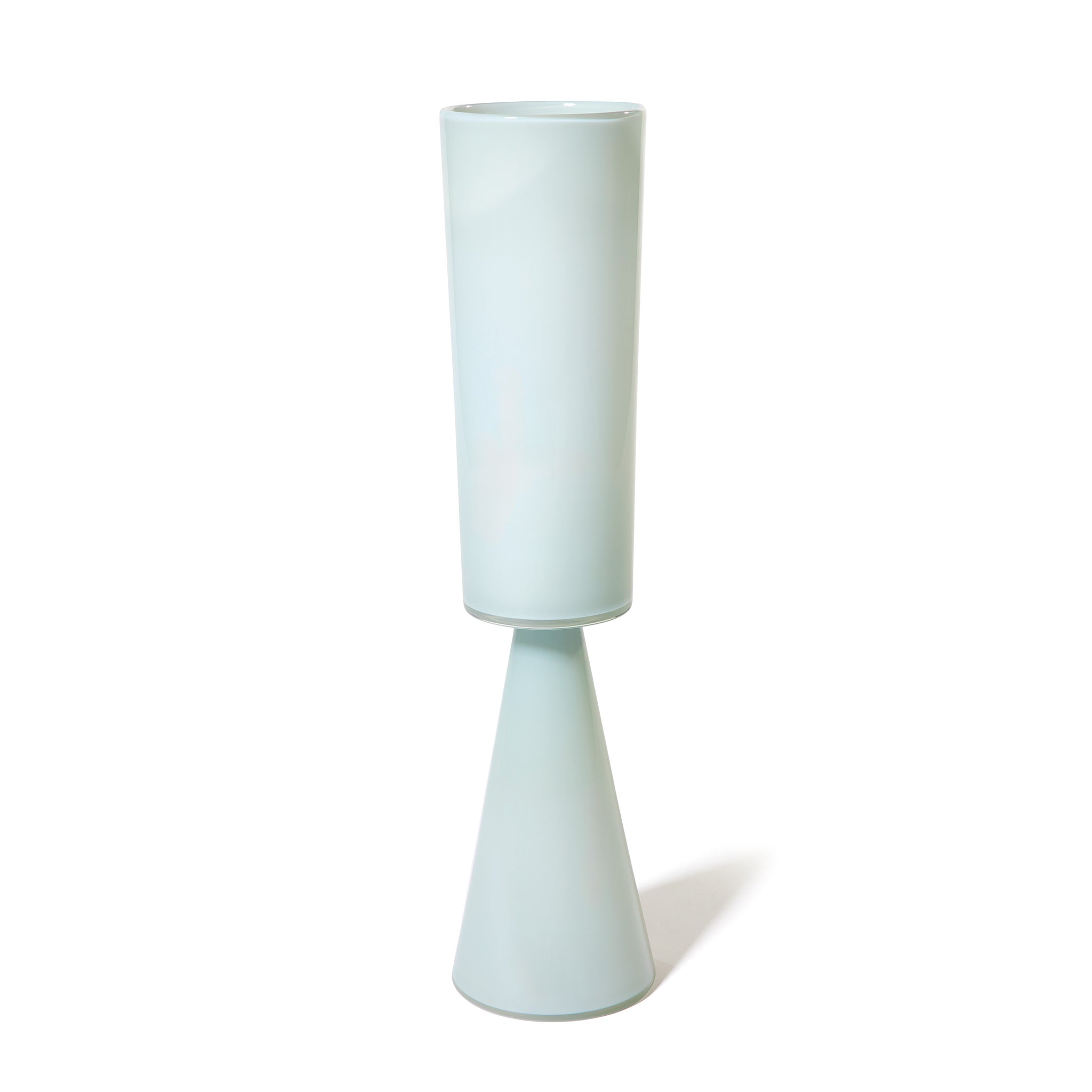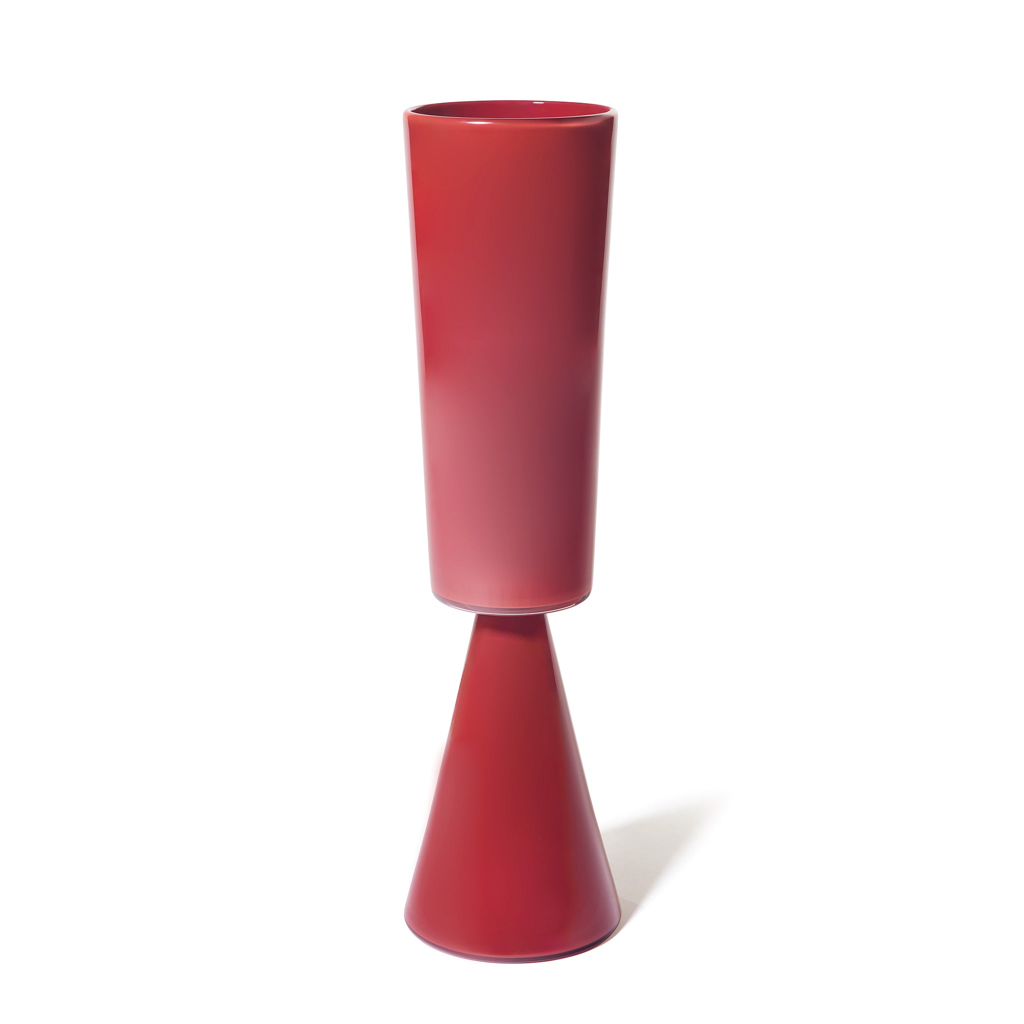 Sleek, statuesque, and effortlessly refined, the Fiorelli Tall Tapered Cylinder brings vertical elegance to the collection. Perched atop a slender conical base, its elongated profile draws the eye upward, creating space for tall stems or sculptural arrangements to shine. The taper adds a sense of being grounded, while the opaque glass finish lends to its colorful depth. Bold in proportion yet minimal in spirit, a striking silhouette that anchors a room with grace and intention.